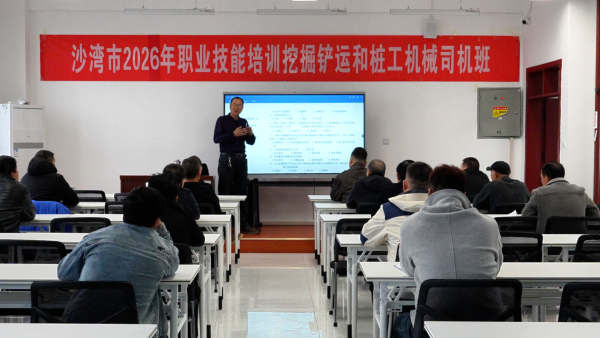 3月13日,在沙湾市技工学校教室内,授课老师正在向学员讲解挖掘机的操作原理和安全规范。学员们聚精会神听讲,不时低头记录,为后续实操训练做好准备。