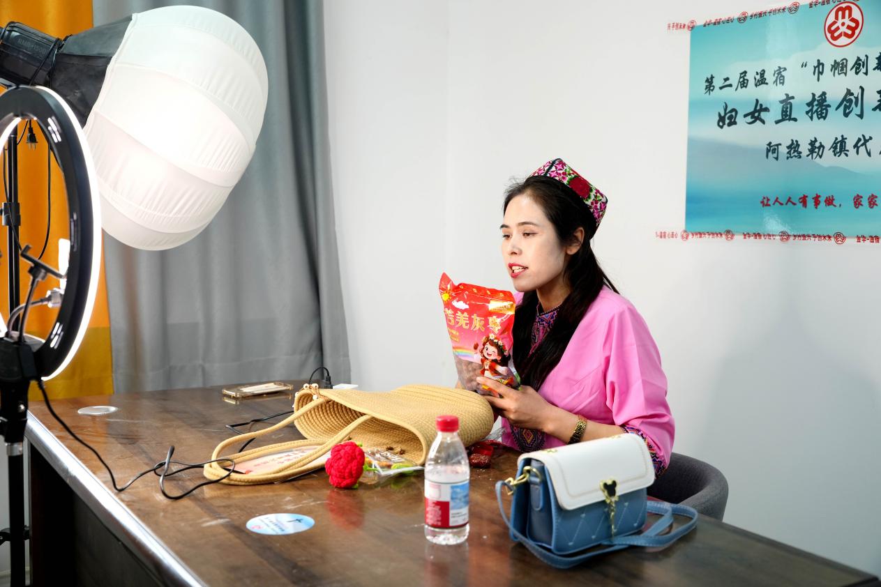 温宿县阿热勒镇皮亚其村的妇联主席吐热克孜·居买克参加第二届温宿妇女直播创新大赛,在直播间向广大网友介绍本地农特产品等各类好物。赵新昌 摄
