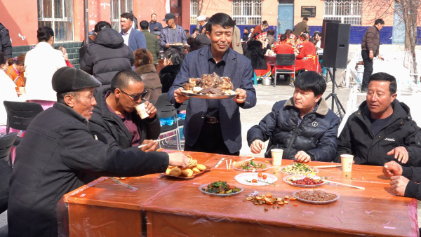 在沙湾市东湾镇东山沟村举办的团圆宴上,正在给村民上传统美食。段江玺摄