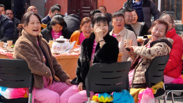 在沙湾市东湾镇东山沟村举办的团圆宴上,村民们观看节目,笑得合不拢嘴。段江玺摄