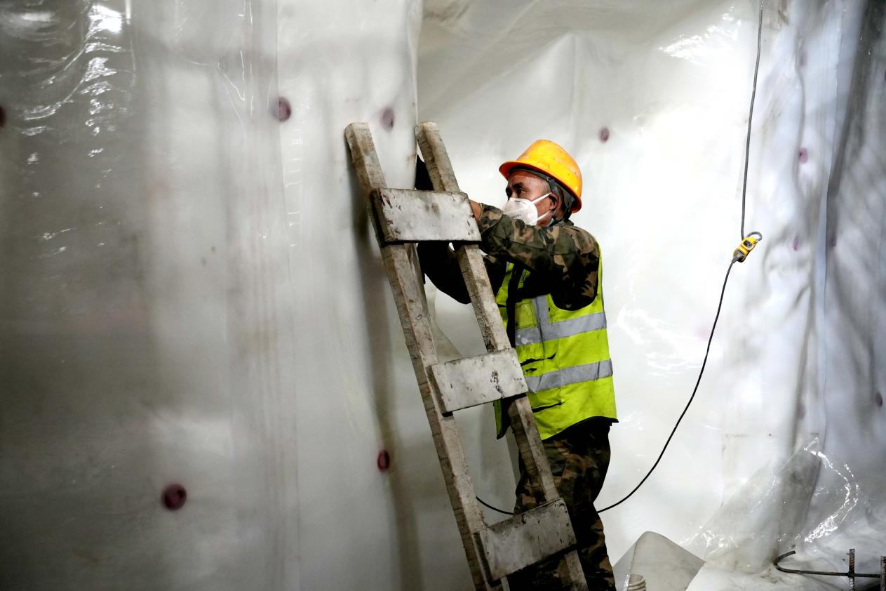 3月22日,在新疆G219线昭苏至温宿公路项目西天山特长隧道主洞内,工作人员正在铺设防水层(赵新昌 摄)