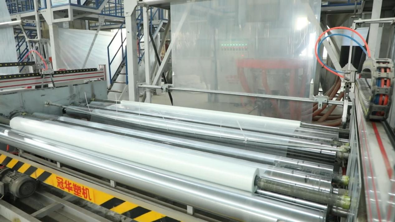 对成型塑料膜进行牵引、整平与收卷,自动化设备提升了生产效率与产品平整度。胡彩艳 摄