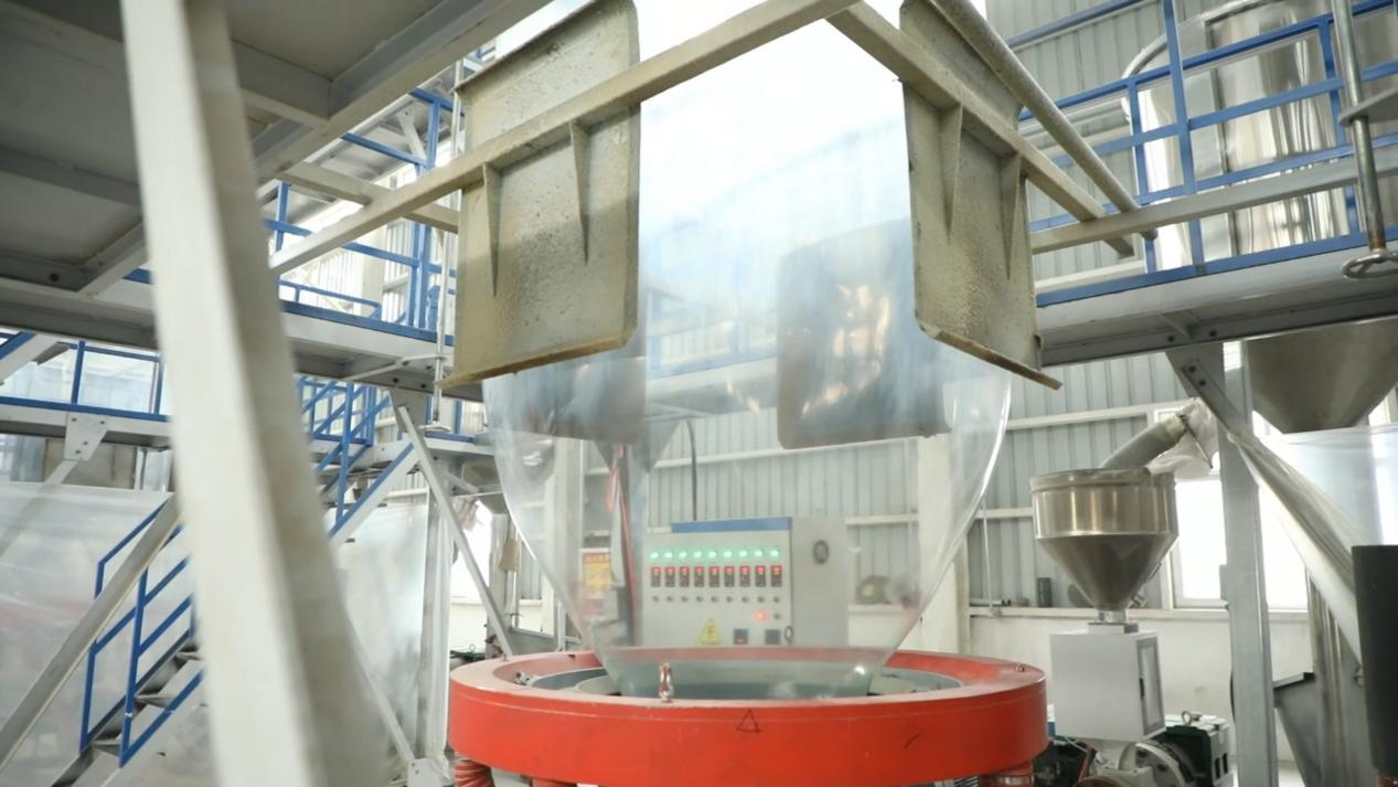 吹膜机稳定运行,透明塑料膜从红色模头匀速挤出。胡彩艳 摄