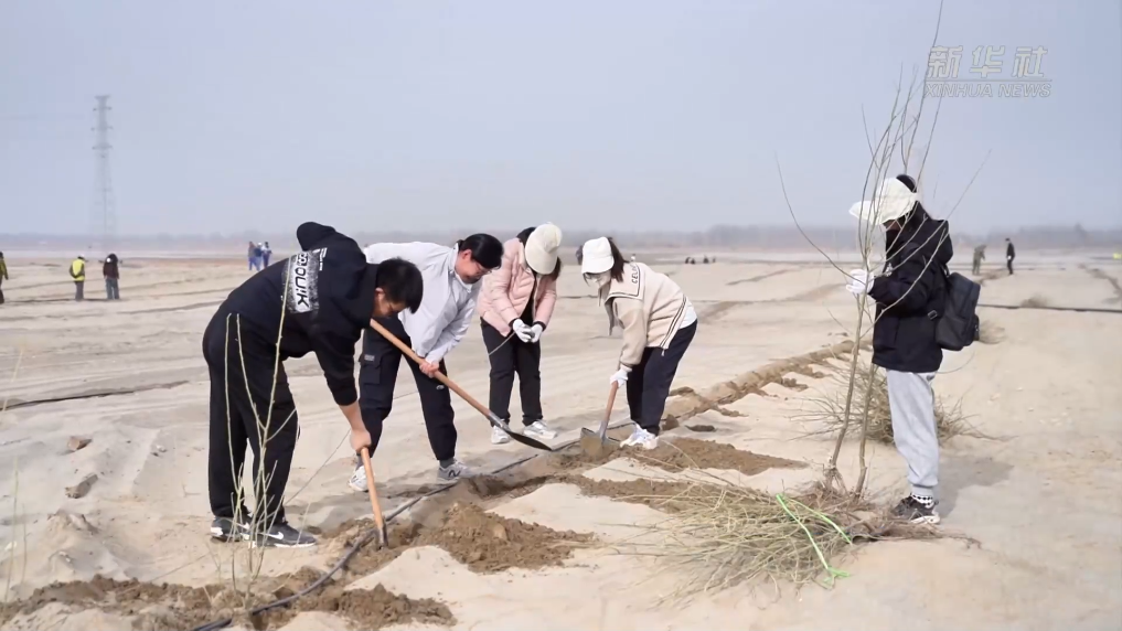 植树现场,大家挥锹挖坑、扶正苗株、细心填土、踩实浇水,一株株新苗迎风挺立,为戈壁沙漠增添勃勃生机。