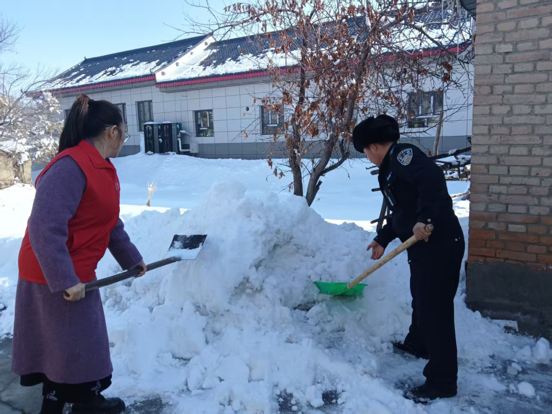 3月19日,大泉乡大泉村村“两委”干部联合辖区派出所辅警,开展“情暖雪天·关爱老人”志愿服务,上门为老人清理庭院及门前积雪。