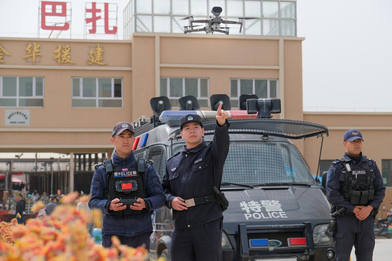 “天上飞着喊,地上走着讲,这阵势我们想记不住都难!”一位摊主吐尼亚孜·吾休尔笑着说。从空中到地面,从传统步巡到科技赋能,温宿公安将无人机巡查与传统巡逻防控深度融合,形成了“空地一体、人机协同”的立体化防控体系,让安全宣传“看得见、听得着、记得牢”,实现了人员密集场所安防效能的全新升级。