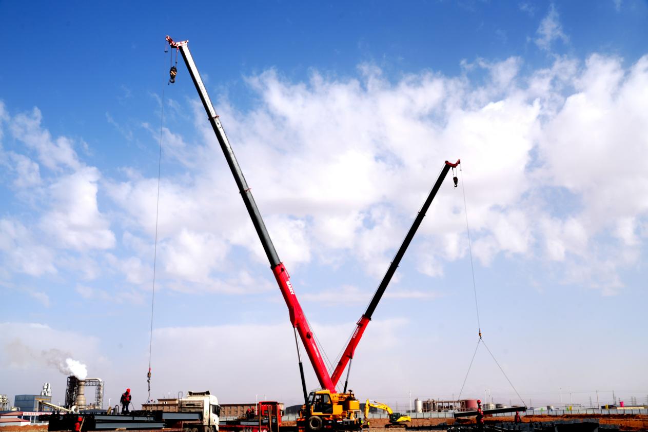 3月25日,在申泰聚酯差别化纤维项目施工现场,施工人员开展吊装作业(赵新昌摄)