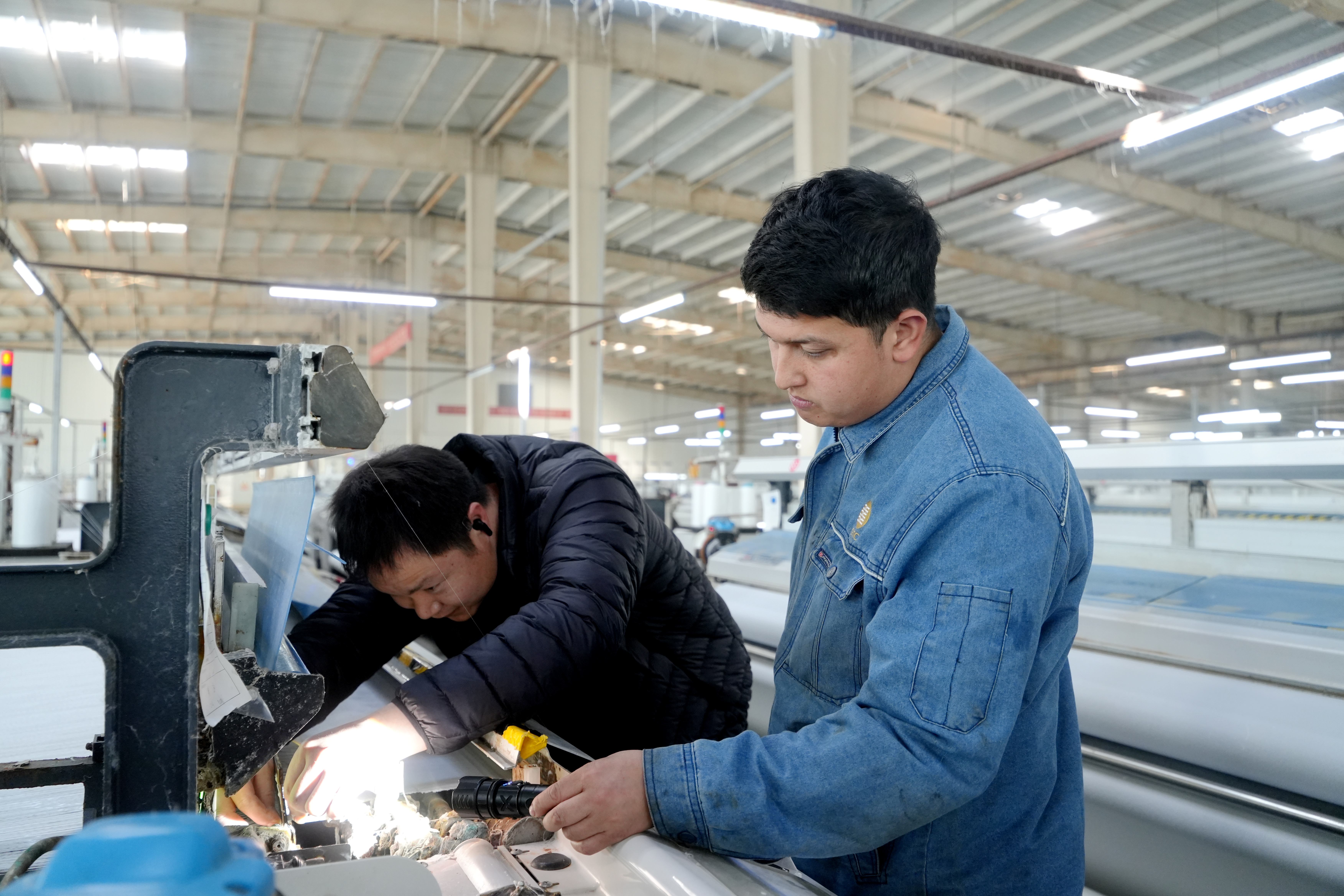浙苏石化家纺科技(阿克苏)有限公司织造事业部保养上轴工班长艾孜买提·艾尼瓦尔和同事给织布做维保(赵新昌 摄)