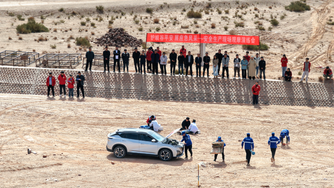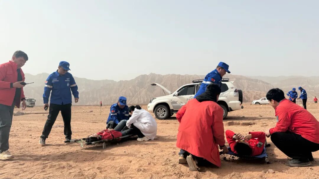 演练模拟场景贴合景区实际:天山托木尔大峡谷景区内部道路上,一辆自驾车因操作不当发生侧翻,车内多名“游客”被困受伤,情况紧急。
