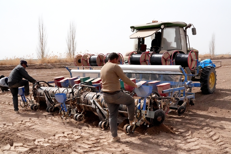 3月27日,农民驾驶大型播种机在温宿县古勒阿瓦提乡提根村的棉田里播种棉花(艾海提·毛勒吐尔迪 摄)