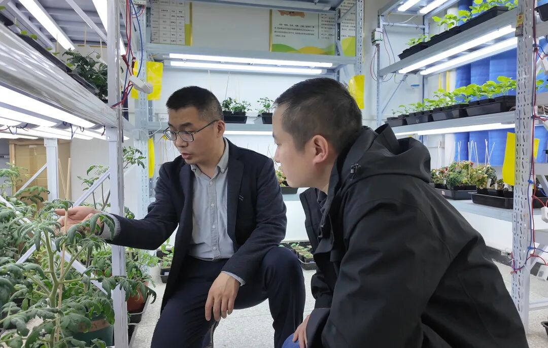 塔里木大学园艺与林学学院副教授胡楠(左)与企业代表在实验室交流番茄品种选育技术细节。胡彩艳 摄