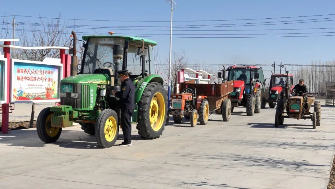 在沙湾市金沟河镇泉水沟村村委会大院,市农业农村局的工作人员正在对前来检验的农机进行全方位“体检”,并现场与农机驾驶操作人员签订《农机安全生产责任书》。