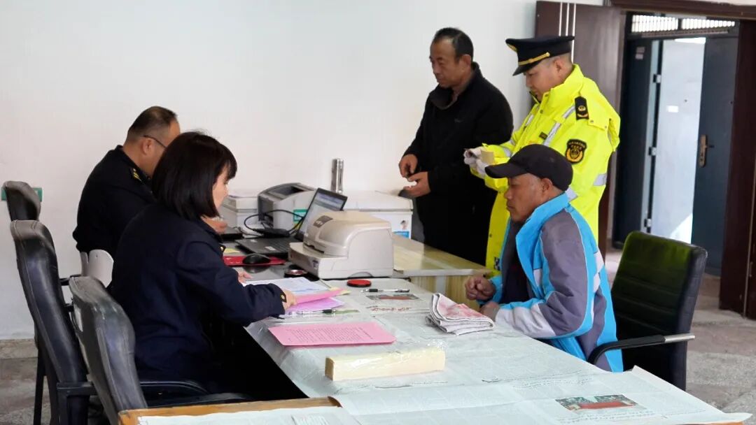 工作人员为农机操作驾驶人员办理年审手续。段江玺摄