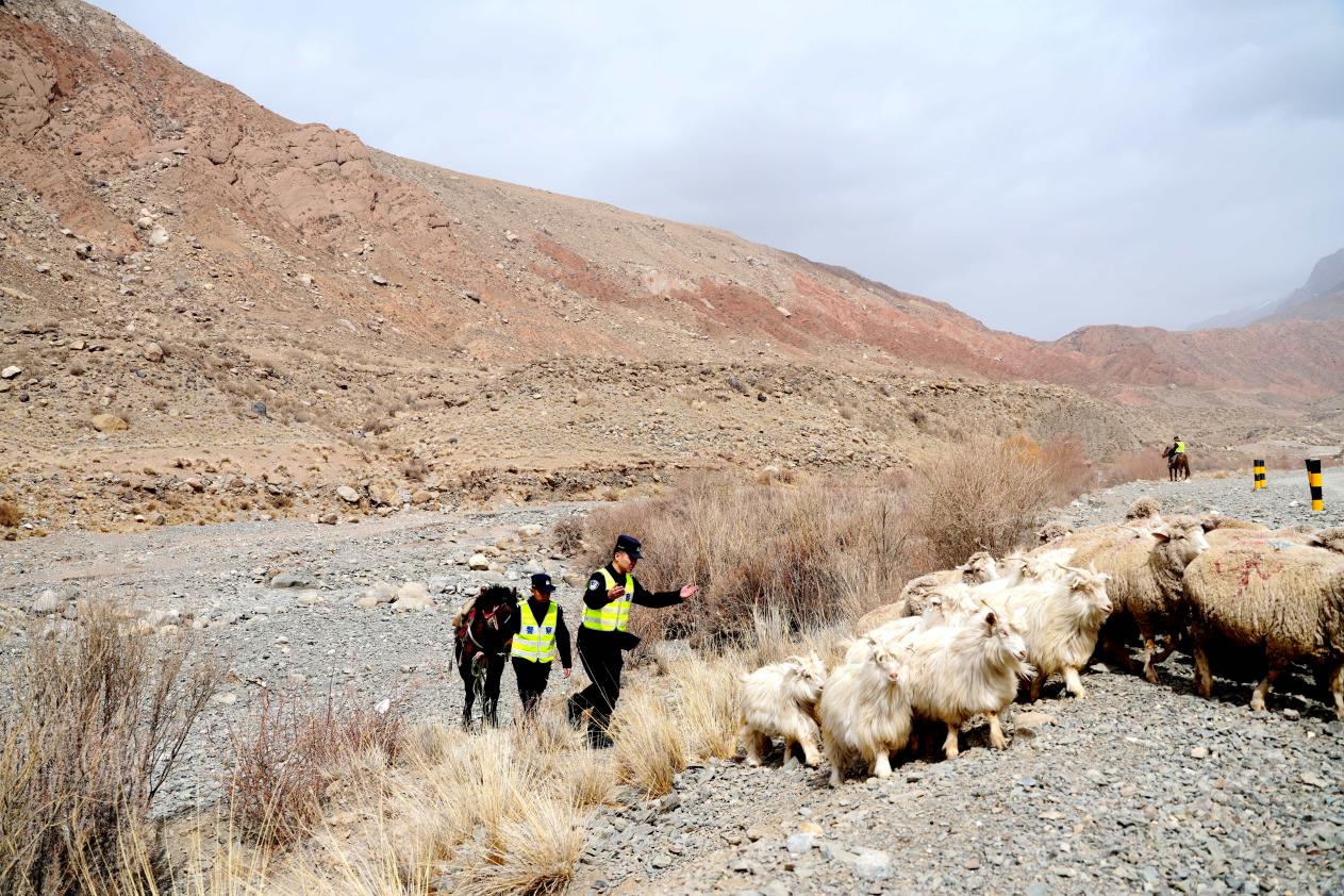 4月1日,由阿克苏边境管理支队温宿边境管理大队、阿克青边境派出所组建的护牧队,协助牧民转场(杨礼文 摄)