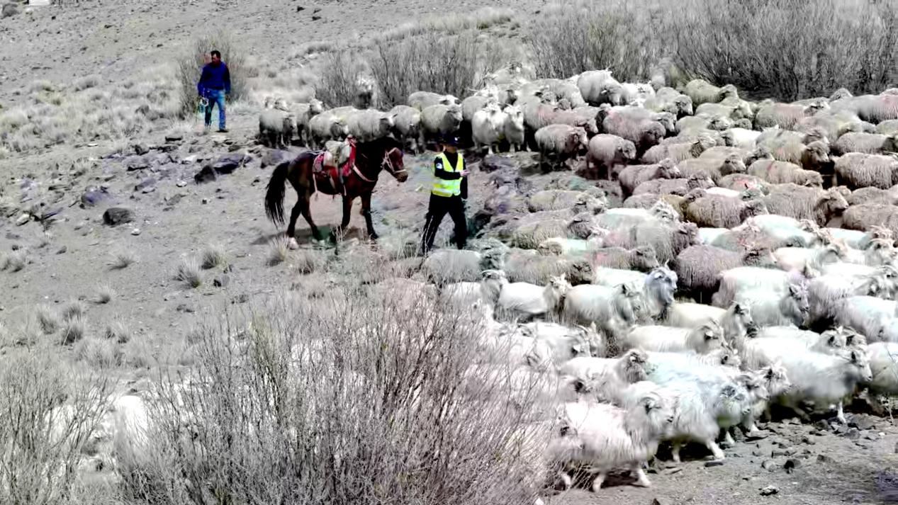 “注意脚下,慢慢走,别让羊群跑散了……”民警刘泽后策马穿行在羊群一侧。这已是他连续第6年参与转场护航。作为经验丰富的边境民警,他熟悉沿途每一处沟壑与河谷,始终走在队伍最外围,既要防止牲畜受惊走散,又要时刻留意牧民的身体状况。队伍上空,一架警用无人机在盘旋巡航。地面民警盯着操作终端,实时画面里清楚显示着前方路况、羊群位置和周边环境。