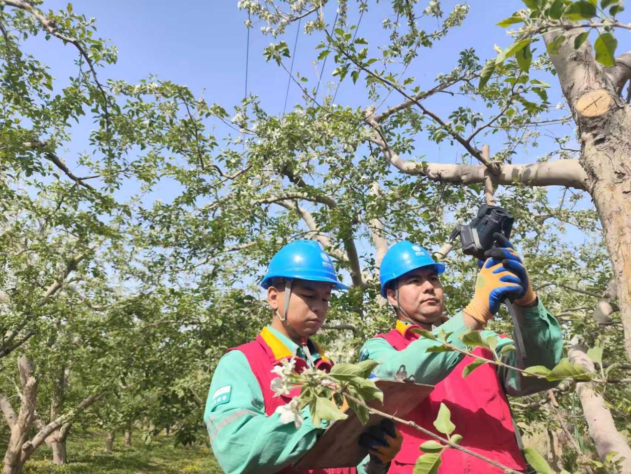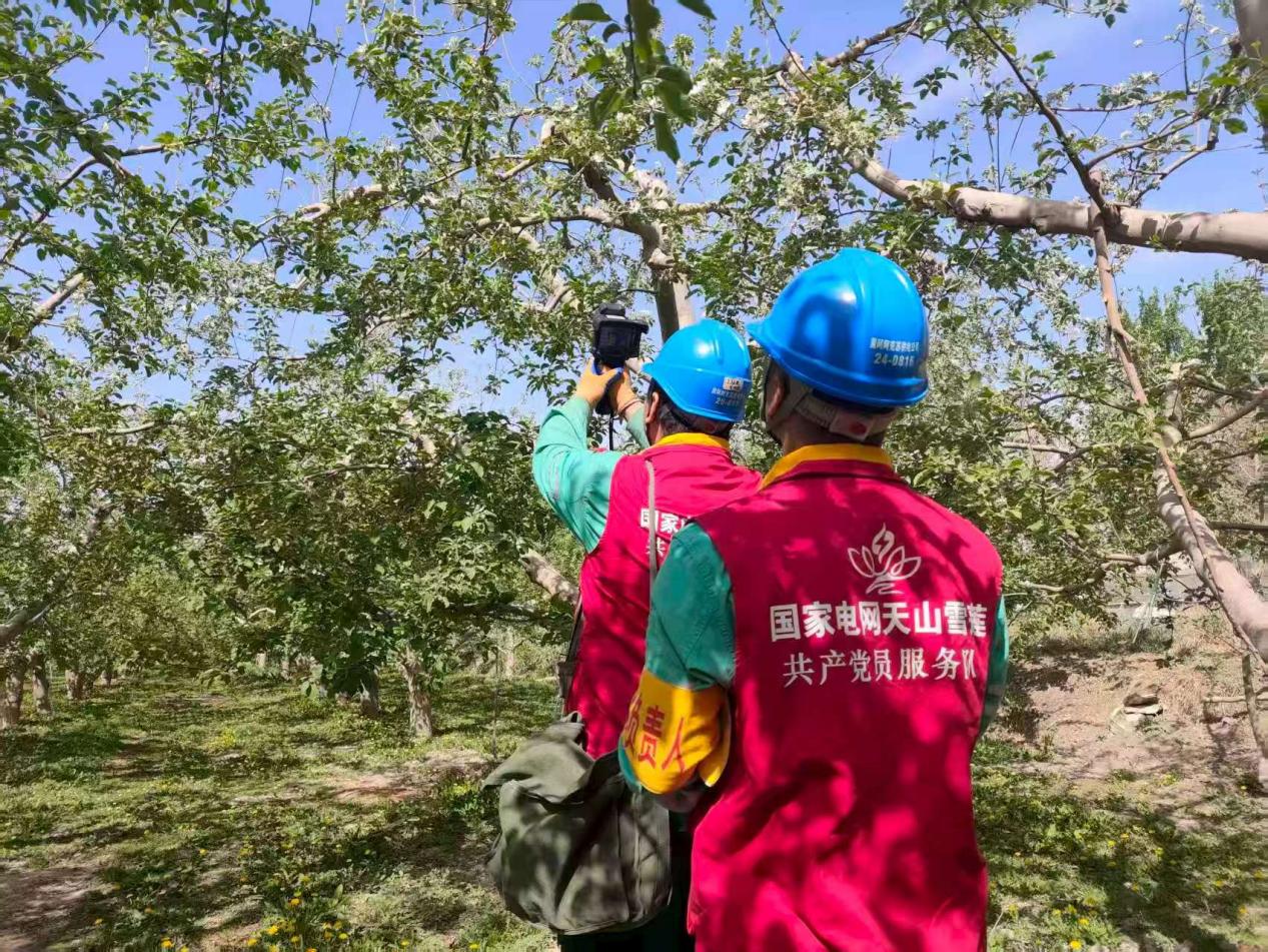 国网温宿县供电公司天山雪莲共产党员服务队队员在苹果园开展首轮用电排查 侯雅清 摄