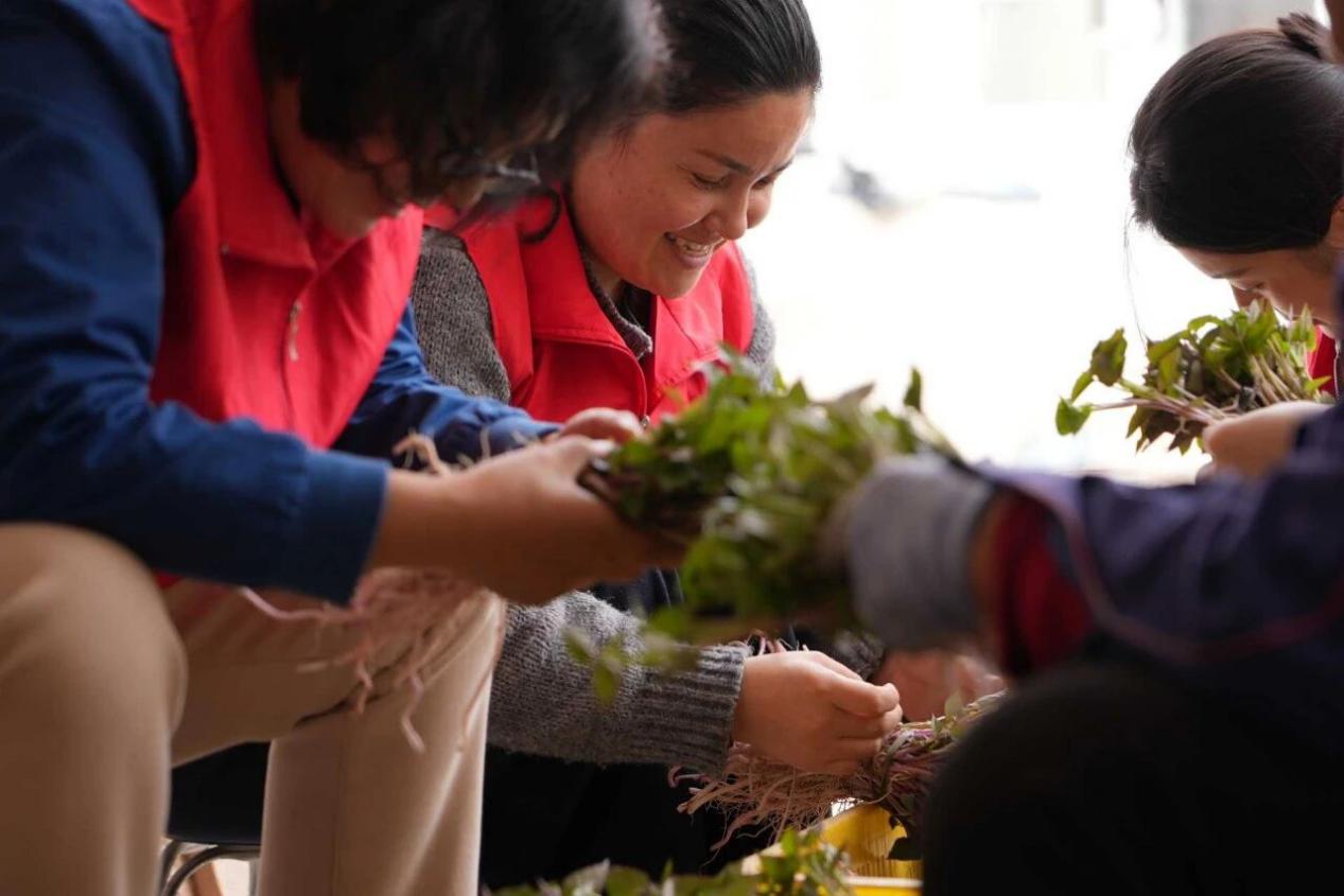 红薯苗采收的时节,也是社区温情涌动的时刻。每年这个时候,社区都会组织志愿服务队深入各家各户,帮忙采收、捆扎、装筐,解决种植户人手不足的难题。志愿者们弯腰劳作的身影与翠绿的红薯苗相映成趣,也让邻里情、干群情在忙碌中愈发浓厚。